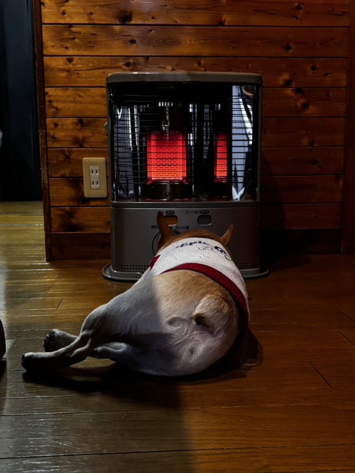 彼はストーブの前から動けません。