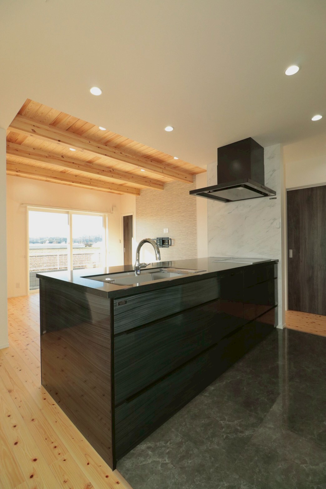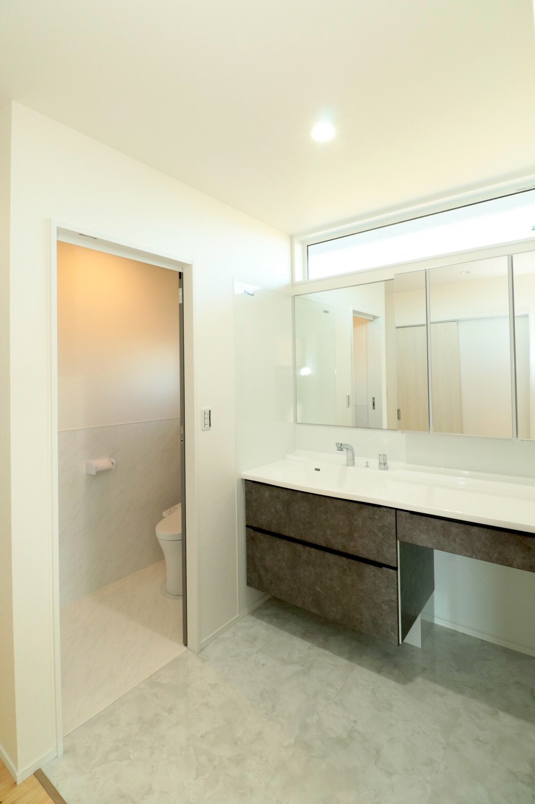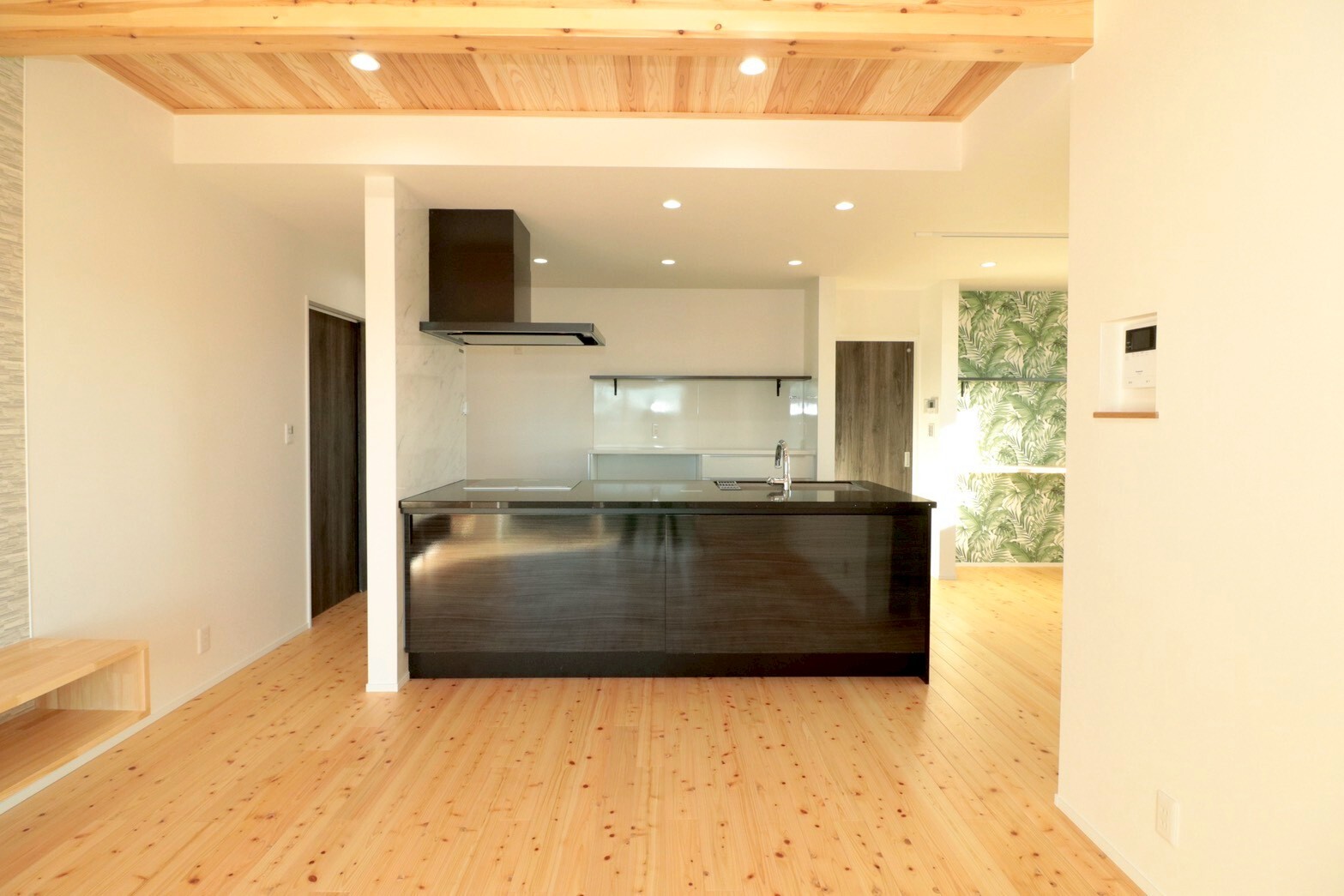 アイランド型のキッチン、広い洗面台、収納を多めに・・・と奥様の希望。